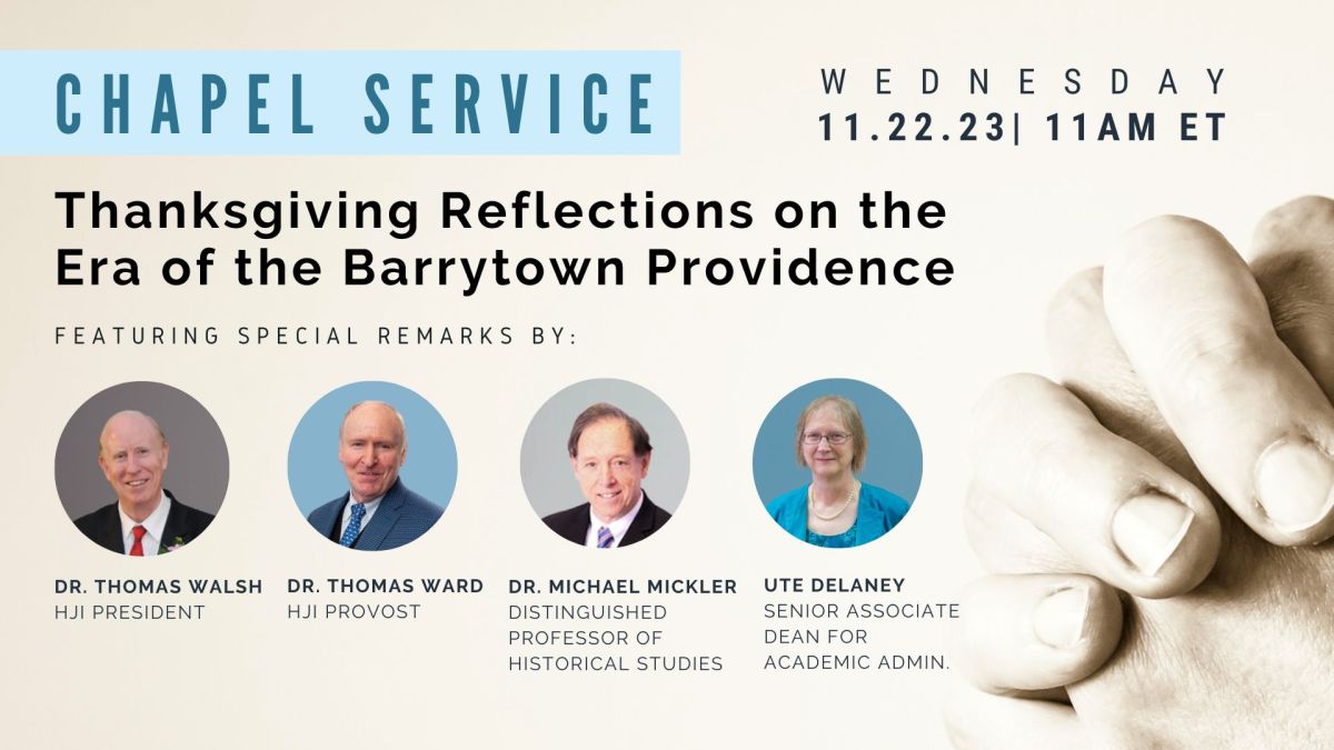 HJI was pleased to hold a virtual chapel service entitled “Thanksgiving Reflections on the Era of the Barrytown Providence” featuring special remarks from Dr. Thomas Walsh, President, Dr. Thomas Ward, Provost, Dr. Michael Mickler, Distinguished Professor of Historical Studies, Ute Delaney, Senior Associate Dean for Academic Administration.