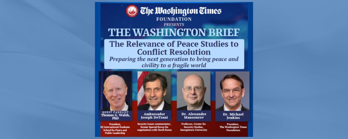 On Tuesday, May 5, Dr. Thomas Walsh, HJI President, was featured as a guest panelist invited by the The Washington Times Foundation’s presentation of the The Washington Brief on the topic, “The Relevance of Peace Studies to Conflict Resolution.” Dr. Walsh joined Ambassador Joseph DeTrani, former Six-Party Talks envoy, and Dr. Alexandre Mansourov, Professor of Security Studies from Georgetown University in this revealing conversation. Dr. Michael Jenkins, President of The Washington Times Foundation, and HJI graduate, was the moderator.
