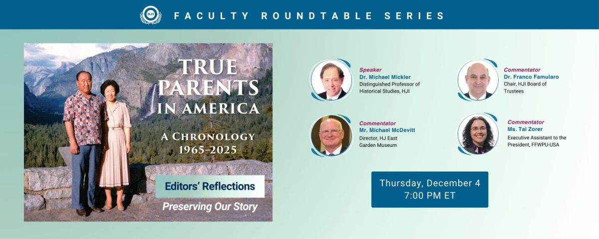 HJI held its Faculty Roundtable Series on Thursday, December 4, and featured Distinguished Professor of Historical Studies at HJI, Dr. Michael Mickler as he shared with us his work and his team upon completing a chronology of True Parents in America 1965-2025. Dr. Franco Famularo, Chair of the HJI Board of Trustees and HJI Alumni, Mr. Michael McDevitt, Director of HJ East Garden Museum and Ms. Tal Zorer, Executive Assistant to the President of FFWPU-USA added their comments and perspectives about the project of preserving the history of Rev. Dr. Sun Myung Moon and Dr. Hak Ja Han in America, as the program unfolded. The presentation was then followed by a Q&A session with the participants.