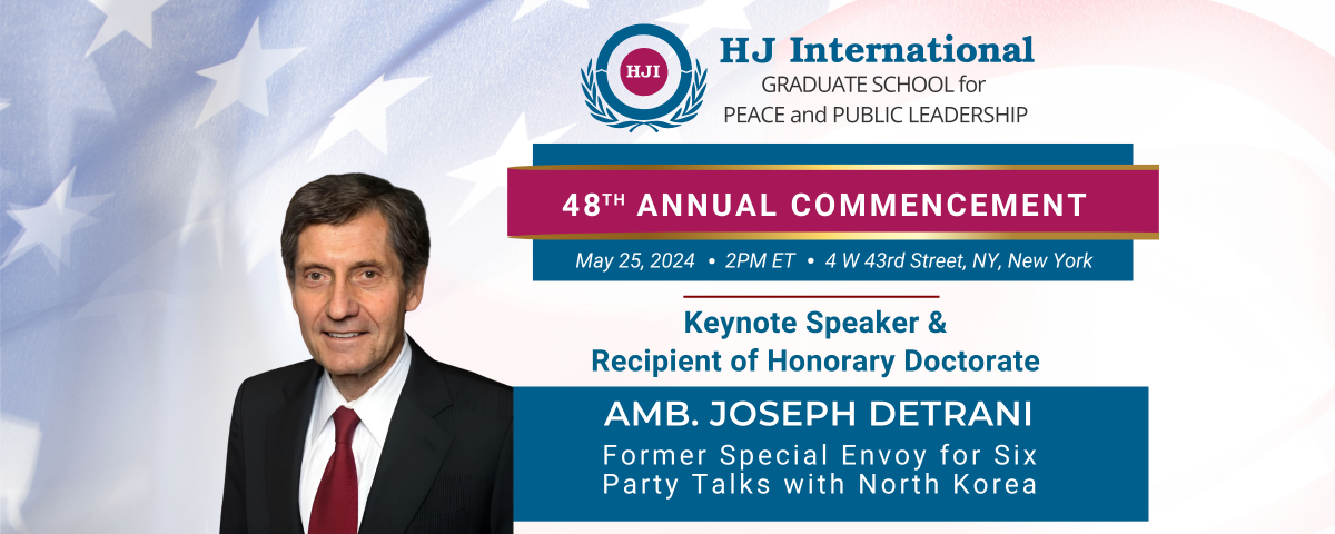 New York, NY, May 1, 2024 – The HJ International Graduate School for Peace and Public Leadership is proud to announce the conferral of an honorary doctorate upon Ambassador Joseph DeTrani as part of its 48th Commencement Ceremony. The event will take place on May 25th at 2:00 pm ET at 4 West 43rd Street, New York, NY.