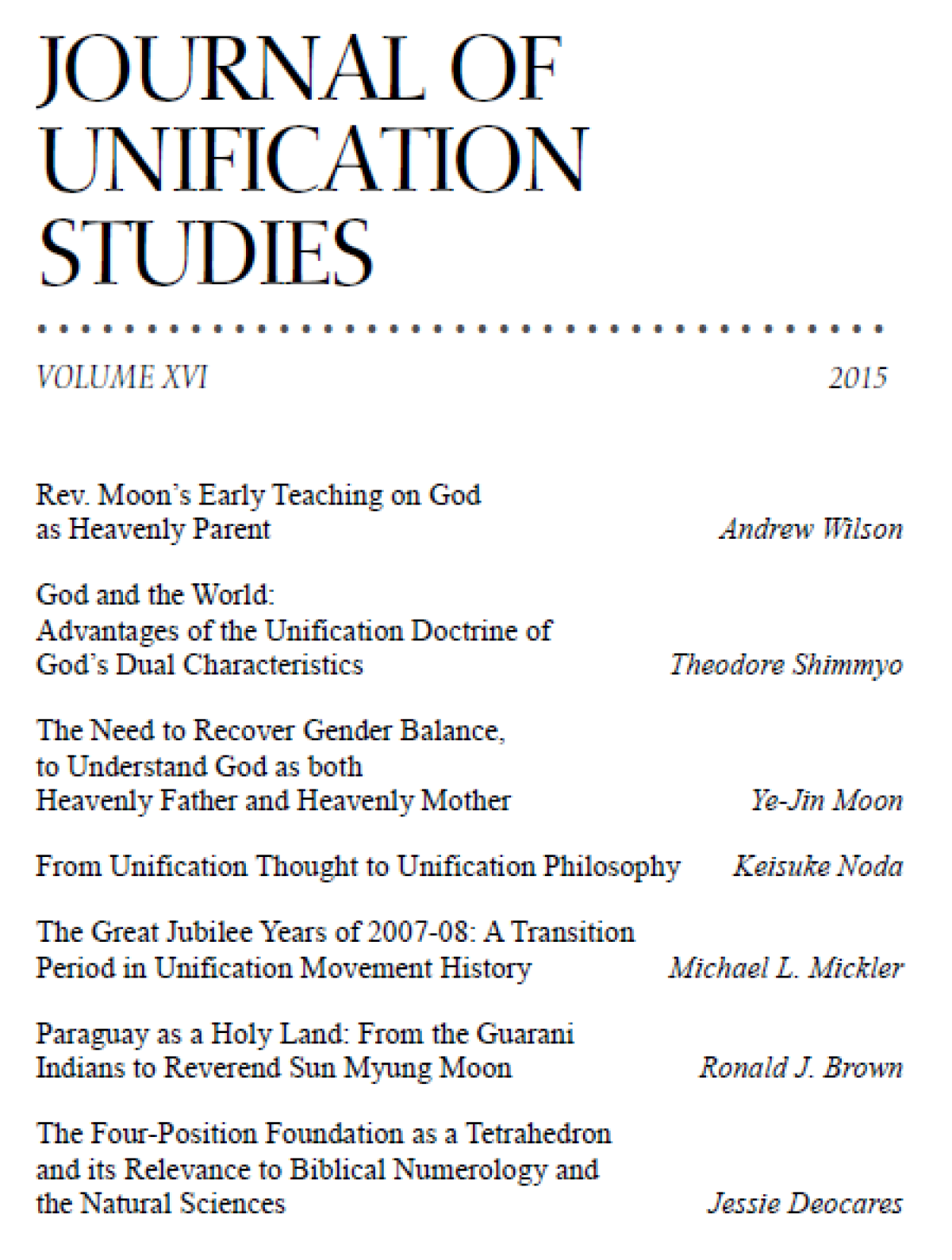 AND ONLINE : The Journal of Unification Studies is published first in print, then later in an online version. Back issues, Volume I (1997) through Volume XV (2014) are published here: www.journals.uts.edu