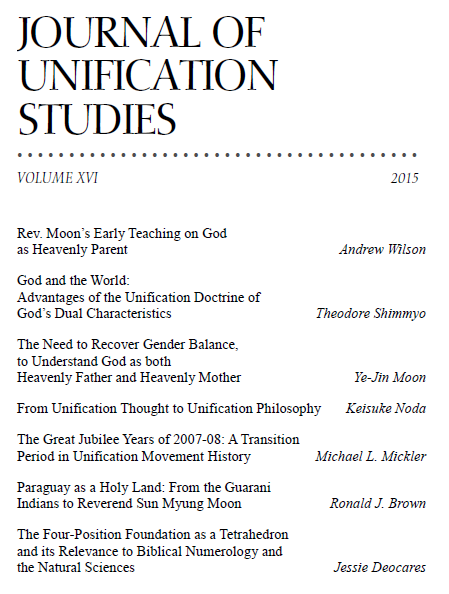 IN PRINT : The 2015 print issue of Journal for Unification Studies is now available for purchase: Subscription rates are $20.00 per issue in the United States, $30.00 for institutions and overseas. Make checks payable to the Unification Theological Seminary.